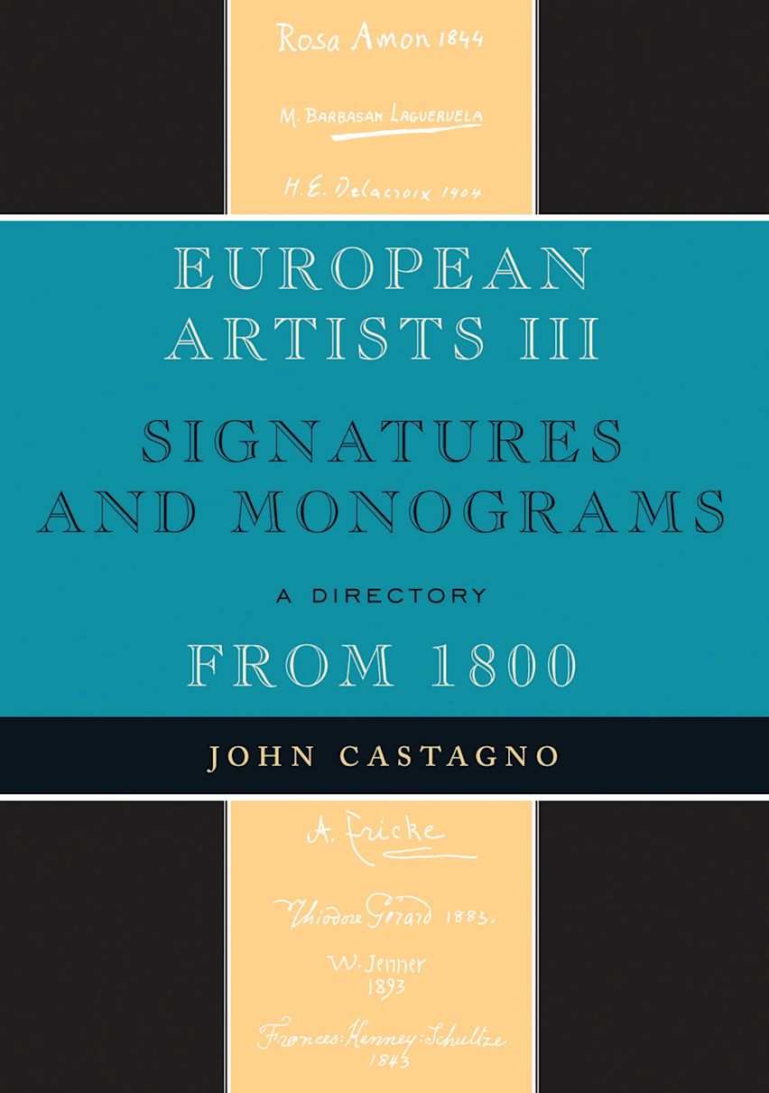In the first volume of European Artists Signatures and Monograms, 1800-1990 (Scarecrow, 1990), Castagno provided identification for more than 4,800 artists' signatures, along with biographical information and reference sources. The second volume, published by Scarecrow in 2007, identified an additional 2,100 artists and featured 3,000 signature examples. This third volume features an additional 2,800 artists and signatures. In addition to the standard signature entries, the book features sections for monograms and initials, common surname signatures, alternative surname signatures, and illegible signatures. Less than five percent of the entries in this volume are listed in the original volumes-and these are included to provide additional information about the artists.